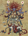 在陈塘关李靖家的三位公子中,老三哪吒名声显赫,而长子金吒却往往被人忽视。然而在神话研究者的视野里,金吒代表着中国神话演变的一个典型范例——一个源自佛教的神祇如何逐渐本土化,最终成为道教与民间信仰中的重要角色。金吒这一神祇的名称演变本身便是一条理解其神格变迁的线索。其梵文名“Kundali”音译最早在唐代佛经中译为“军荼利”(亦作“君荼利”),原意为“盘绕”,引申出“甘露、宝瓶、灵蛇”等含义。在古书中,这一名号有軍叱、军叱、军吒、君吒、金咤等多种写法。从“军荼利”到“金吒”的转变,反映了这一神祇从佛教密宗