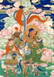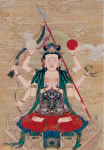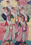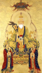 月孛星君,道教尊为太乙华阴月孛星君,与神首罗睺星君、神尾计都星君、天一紫炁星君合称四余。与太阳星君、太阴星君、火德星君、木德星君、土德星君、金德星君、水德星君等“七政”合称十一大曜星君。其中,罗睺星君、计都星君为逆日月而行;紫炁星君、月孛星君为顺日月而行。月孛星君的职责是:主九天之下一切凶杀。其他星君一样,在南北朝之前,也有其动物般的形象。正因其特殊的职责所在,所以在《太上三十六部尊经》中记载,其样貌为蛇。在后来有了“人”的化身容貌之后,他的形象是头戴星冠,身披玄紫色的长袍,袍上绣有仙鹤图纹,俨