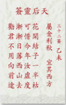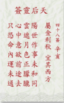 观音灵签 第79签 暗扶倒铜旗;吉凶-中上签;宫位--午宫;灵签诗文 虚空结愿保平安 保得身安愿不还 莫忘神圣宜还了 此知神语莫轻慢签语此卦信实莫信虚之象,凡事守旧之兆也解签人有我见 心不用忙 观音指示 切莫轻慢家宅-还愿自身-许经求财-守份交易-谨慎婚姻-虚六甲-生女行人-滞田蚕-七分六畜-损寻人-杳讼-和移徙-守失物-西方病-解山坟-西向人物故事隋唐故事:东岭关杨义臣摆一座铜旗阵(以一支大旗杆为主)坚强无比,守将东方伯,有万夫莫当之勇,秦叔宝领兵来攻打,罗艺知道了,就命令公子罗成保护铜旗阵,罗成答应,但他母亲说他必须