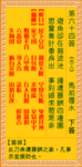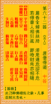 观音灵签 第62签 唐僧得道;吉凶-中中签;宫位--寅宫;灵签诗文 晨昏全赖佛扶持虽是逢危不见危若得贵人来接引此时福禄自相随签语此卦神佛暗佑之象,凡事忍耐大吉也解签平平稳稳 四方名显 改旧从新 亦无凶险家宅-安自身-吉求财-顺交易-利婚姻-成六甲-女行人-寻人-至田蚕-熟六畜-旺讼-有理移徙-吉失物-凶病-即痊愈山坟-大 吉人物故事唐僧一天来到河边,佛祖灵山在望。有一独木桥唐僧不敢走过,佛祖化身船夫并撑著无底破船,唐僧跌下河中,被船夫救起,唐僧就此得证佛道了。 唐三藏信姓陈名,十三岁出家,法号玄奘,往天竺(印度)取经历尽艰