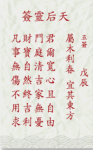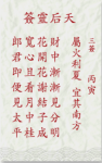 观音灵签 第99签 陶三春挂帅;吉凶--下平签;宫位--亥宫;灵签诗文 勒马持鞭直过来 半有忧危半有灾 恰似遭火焚烧屋 天降时雨荡成灰 签语此卦半忧半喜之象,凡事只宜行善也解签终身劳力 莫管是非 枷锁临身 怨尤自至家宅-祈保自身-守慎求财-破交易-阻婚姻-刑克田蚕-不利六畜-损六甲-险行人-困寻人-招非讼-亏移徙-守旧失物-见疾病-忧危山坟-败人物故事陶三春即宋朝初年郑恩(子明)之妻。初,赵匡胤和郑恩结拜为兄弟,著名武师陶洪有女名陶三春,郑恩与之比武,不能取胜。陶洪爱郑恩之武艺人才,将三春许配与他为妻。后来三春之子郑印长