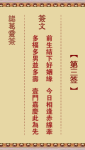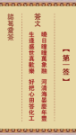 第二首臣报君恩子报亲、五伦无愧感神明、一帆顺境凭君去、灾难消除福禄生。五伦:古时以君臣、父子、夫妇、兄弟、朋友等人际关系称为五伦。褔禄寿:人事齐全为褔;有官爵为禄;年高为寿。诸葛神签第2签吉凶解签功名:腊尽梅开、时来运至。行人:灯花报喜、好音自来。婚姻:夫妻和顺、合生贵子。官司:诸事顺理、自然亨通。丁口:平安为福、长幼咸安。生意:所求安分、必有大利。疾病:如鱼得水、勿药有喜。出行:有志四方、无往不利。失物:何必担心、隐而复现。田畜:生育茂盛、灾障消除。………………………………………………………………