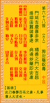 观音灵签 第68签 郭汾阳祝寿;吉凶-中上签;宫位--卯宫;灵签诗文 门庭清吉梦祯祥积善于门大吉昌讼理婚成蚕又熟病逢良药得安康签语此卦春梦百花之象,凡事贵人大吉也解签春深日暖 百花自开 事莫迟疑 从人显达家宅-旺自身-安求财-春旺交易-遂婚姻-成六甲-防惊行人-到田蚕-利六畜-旺寻人-至讼-胜移徙-如意失物-急寻病-安山坟-大吉人物故事窦燕山因行善积德,后生五子,一门显贵。五子名为‘窦伦、窦信、窦仁、窦仪、窦偃。一日窦仪投宿某客栈,上天要试窦仪的心,于是派遣金精化为女子,诈称临家少女,夜扣窦仪房门,窦仪闭户不纳,此女以投