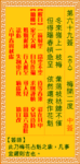 观音灵签 第99签 陶三春挂帅;吉凶--下平签;宫位--亥宫;灵签诗文 勒马持鞭直过来 半有忧危半有灾 恰似遭火焚烧屋 天降时雨荡成灰 签语此卦半忧半喜之象,凡事只宜行善也解签终身劳力 莫管是非 枷锁临身 怨尤自至家宅-祈保自身-守慎求财-破交易-阻婚姻-刑克田蚕-不利六畜-损六甲-险行人-困寻人-招非讼-亏移徙-守旧失物-见疾病-忧危山坟-败人物故事陶三春即宋朝初年郑恩(子明)之妻。初,赵匡胤和郑恩结拜为兄弟,著名武师陶洪有女名陶三春,郑恩与之比武,不能取胜。陶洪爱郑恩之武艺人才,将三春许配与他为妻。后来三春之子郑印长