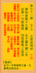 观音灵签 第79签 暗扶倒铜旗;吉凶-中上签;宫位--午宫;灵签诗文 虚空结愿保平安 保得身安愿不还 莫忘神圣宜还了 此知神语莫轻慢签语此卦信实莫信虚之象,凡事守旧之兆也解签人有我见 心不用忙 观音指示 切莫轻慢家宅-还愿自身-许经求财-守份交易-谨慎婚姻-虚六甲-生女行人-滞田蚕-七分六畜-损寻人-杳讼-和移徙-守失物-西方病-解山坟-西向人物故事隋唐故事:东岭关杨义臣摆一座铜旗阵(以一支大旗杆为主)坚强无比,守将东方伯,有万夫莫当之勇,秦叔宝领兵来攻打,罗艺知道了,就命令公子罗成保护铜旗阵,罗成答应,但他母亲说他必须