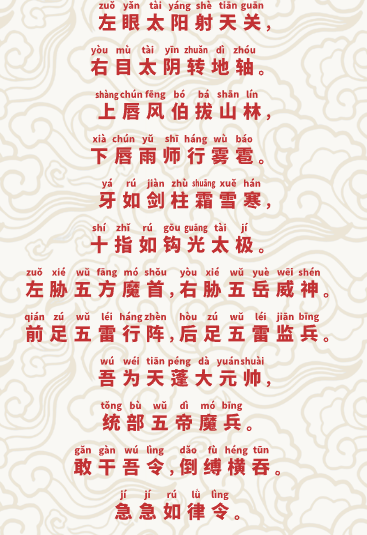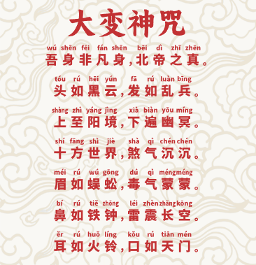 大变神咒原文 吾身非凡身,北帝之真。 头如黑云,发如乱兵。 上至阳境,下遍幽冥。 十方世界,煞气沉沉。 眉如蜈蚣,毒气蒙蒙。 鼻如铁钟,雷震长空。 耳如火铃,口如天门。 左眼太阳射天关,右目太阴转地轴。 上唇风伯拔山林,下唇雨师行雾雹。 牙如剑柱霜雪寒,十指如钩光太极。 左胁五方魔首,右胁五岳威神。 前足五雷行阵,后足五雷监兵。 吾为天蓬大元帅,统部五帝魔兵。 敢干吾令,倒缚横吞。急急如律令。