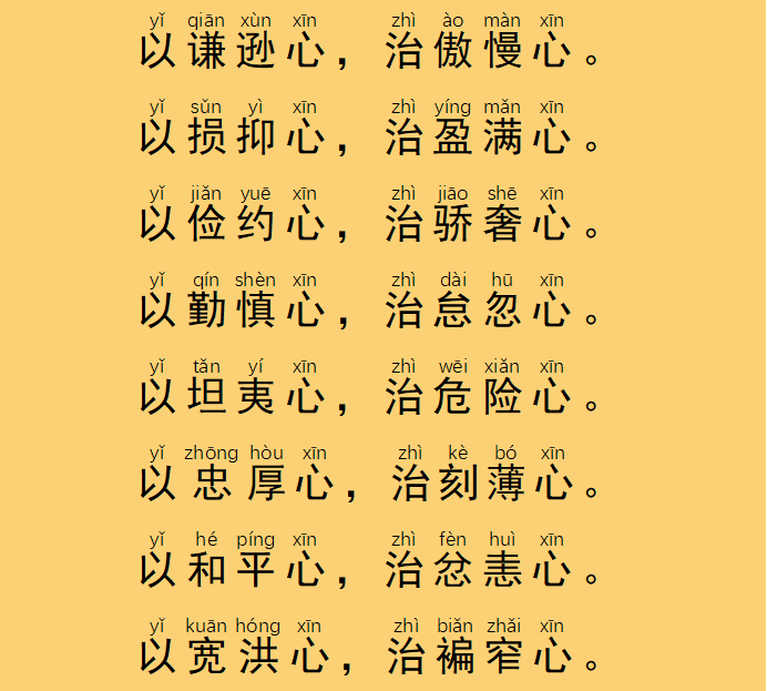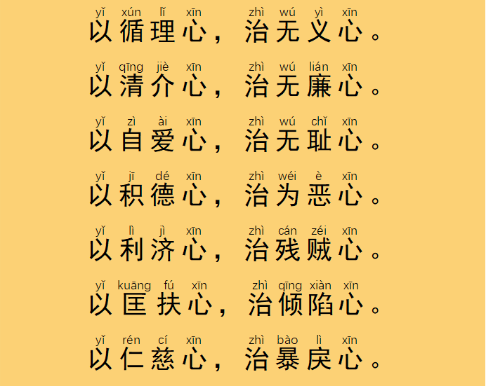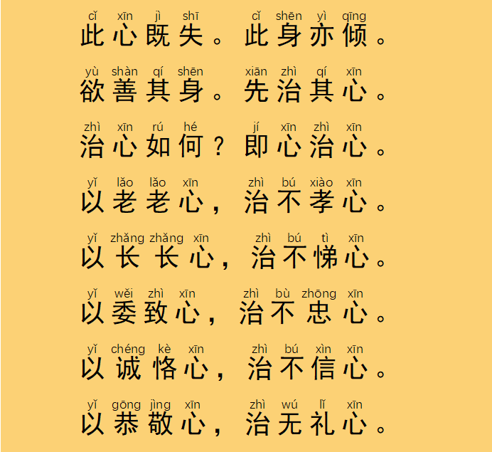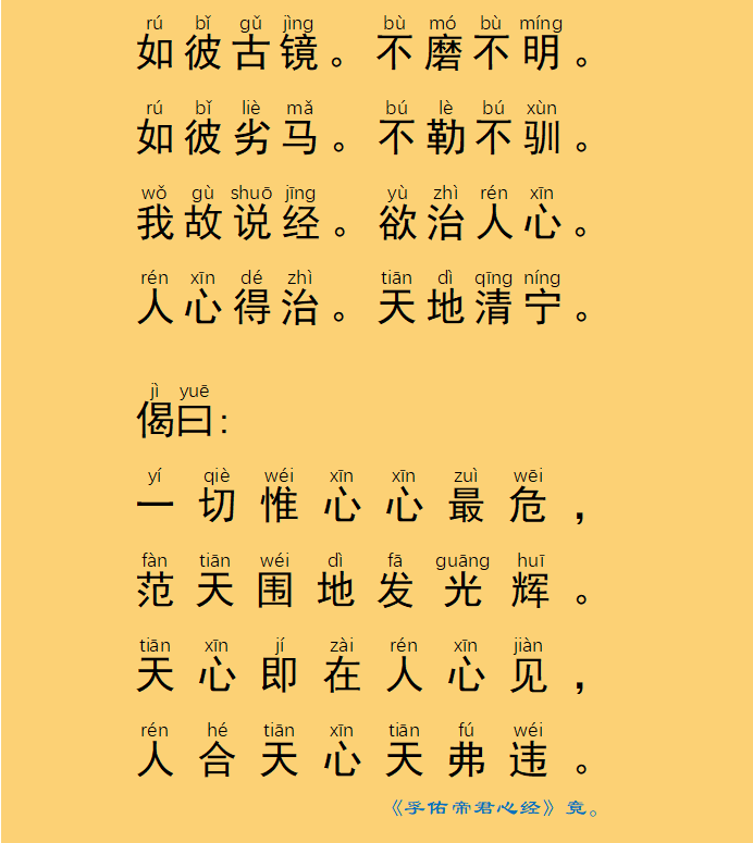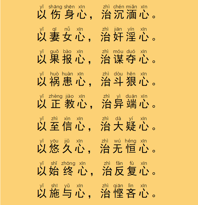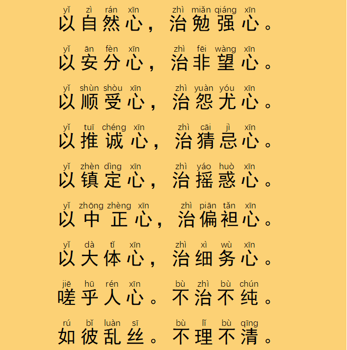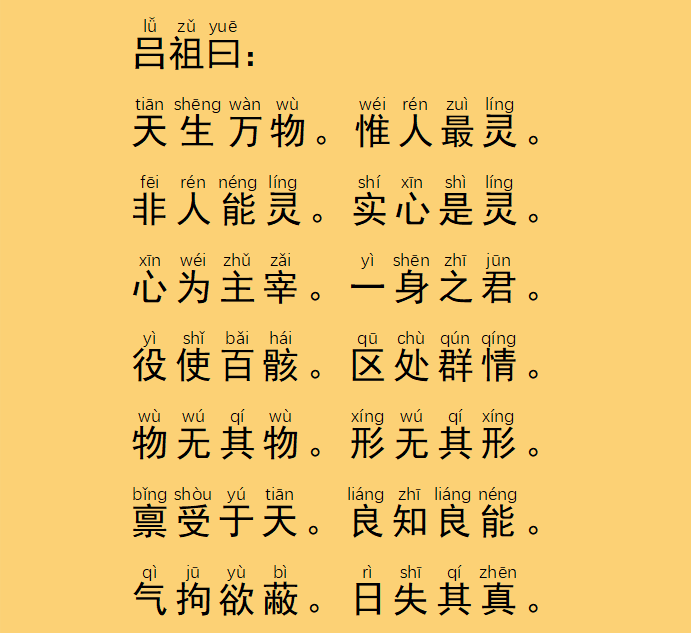 吕祖曰:天生万物,惟人最灵。非人能灵,实心是灵。心为主宰,一身之君。役使百骸,区处群情。物无其物,形无其形。禀(bǐng)受于天,良知良能。气拘欲蔽,日失其真。此心即失,此身亦倾。欲善其身,先治其心。治心如何?即心治心。 以老老心,治不孝心;以长长(zhǎng)心,治不悌(tì)心;以委致心,治不忠心;以诚恪(kè)心,治不信心;以恭敬心,治无礼心;以循理心,治无义心;以清介心,治无廉心;以自爱心,治无耻心;以积德心,治为恶心;以利济心,治残贼心;以匡扶心,治倾陷心;以仁慈心,治暴戾(lì)心;以谦逊心,治傲慢心;以损抑心,治盈满心;以俭约心,治骄奢心;以勤慎心,治怠忽心;以坦夷心,治危险心;以忠厚心,治刻薄心;以和平心,治忿恚(huì)心;以宽洪心,治偏窄心;以伤身心,治沉湎心;以妻女心,治奸淫心;以果报心,治谋夺心;以祸患心,治斗狠心;以正教心,治异端心;以至信心,治大疑心;以悠久心,治无恒心;以始终心,治反覆心;以施与心,治悭吝(qiān lìn)心;以自然心,治勉强心;以安分心,治非妄心;以顺受心,治怨尤心;以推诚心,治猜忌心;以镇定心,治摇惑心;以中正心,治偏袒心;以大体心,治细务心。 嗟(jiē)乎人心,不治不纯。如比(彼)乱丝,不理不清;如彼古镜,不磨不明;如彼劣马,不勒不驯。我故说经,欲治人心。人心得治,天地清宁。 偈(jì)曰:一切惟心心最危,范天围地发光辉。天心即在人心见,人合天心天弗违。