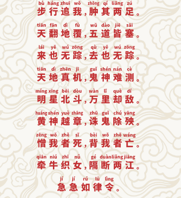 此咒的大意是:那那驿驿(密咒)。左面牵带着南斗六星,右面拉着北极星。杂念多得像翻江倒海一样久久不散,那么更多的杂欲就让你昏乱塞迷。把东说成西,把南说成北。假如被邪魔恶鬼迷惑,心智一定受到侵害。现在如果有来追我的邪鬼,我让它找不到路;有乘车来追我的,我让它的坐车轮轴断裂;有骑马来追我的邪鬼,我让它两眼盲瞎。从空中飞来追我的邪鬼,我让它两翅秃兀。有步行来追我的邪鬼,我让它双脚浮肿。天翻地覆,把邪鬼前来的五种途径全部堵塞。我来也没有形踪,去也没有踪影。天和地的神秘,鬼神是难以测度的。北斗七星可以拒敌于万里之外。黄神越章可以诛斩鬼怪、扫除祸殃。憎恨我的我让它死去,背叛我的我让它灭亡。我远离鬼邪如同牵牛和织女星,天河相隔,只能相望不能相及。赶快像雷部疾鬼律令那样去执行命令。
