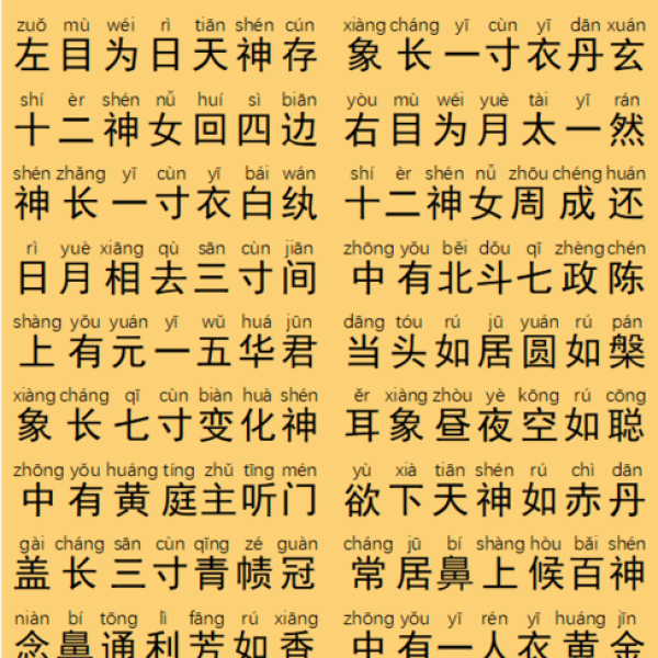 天尊言:身中九灵,何不召之?一曰天生,二曰无英,三曰玄珠,四曰正中,五曰子丹,六曰回回,七曰丹元,八曰太渊,九曰灵童,召之则吉。身中三精,何不呼之?一曰台光,二曰爽灵,三曰幽精,呼之则庆。五心烦懑(音“闷”),六脉抢攘,四肢失宁,百节告急,宜诵此经。